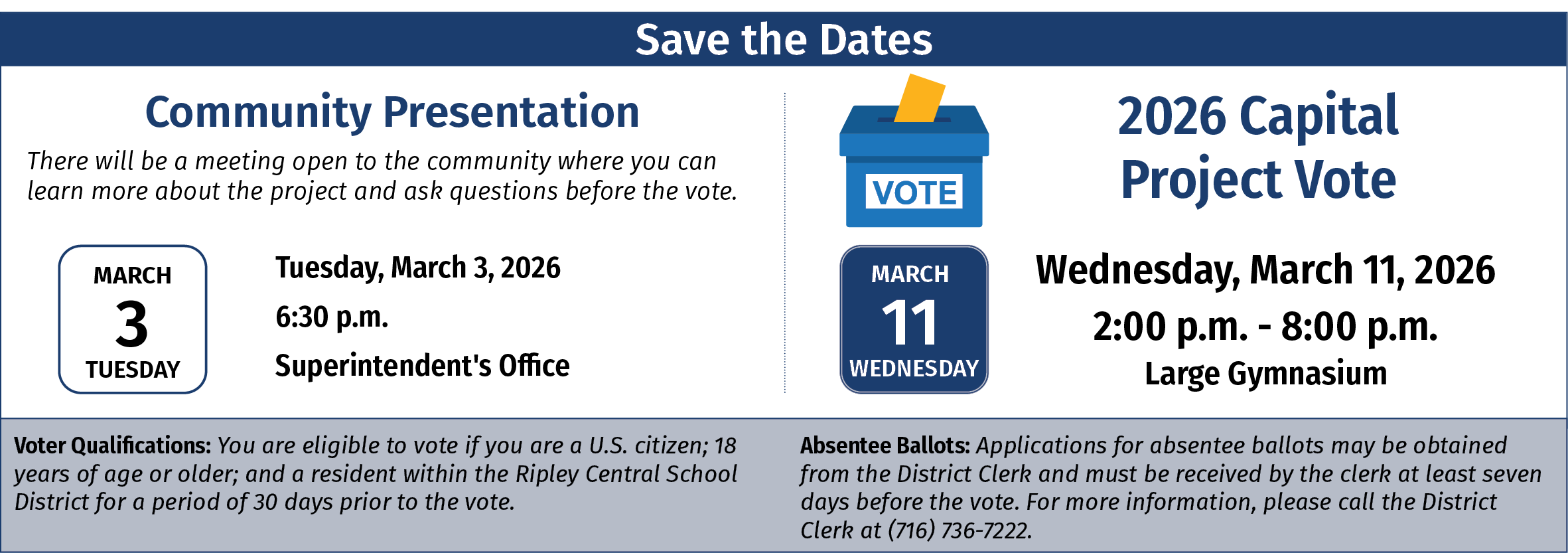 On Wednesday, March 11, 2026, residents of the Ripley Central School District will have an opportunity to vote on the 2026 Capital Project proposition. The proposed project is designed to ensure that our facilities are up to date, conducive for learning, and safe for both students and staff.