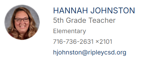 Stay in Touch: Email: hjohnston@ripleycsd.org, Phone: (716) 736-2631 ext 2101, Message me on Rooms on Ripley App!